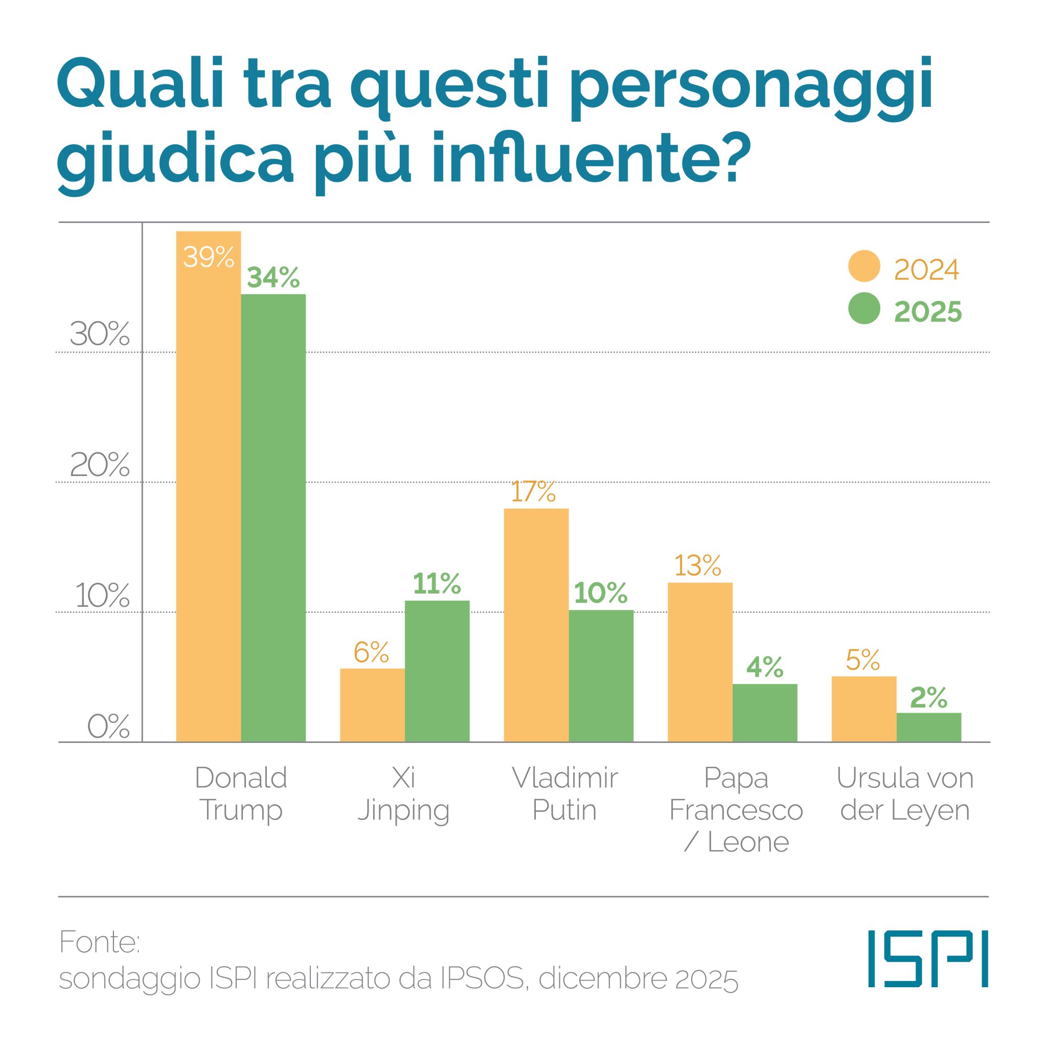 Eppure, qui emerge un paradosso solo apparente. Donald Trump è giudicato negativamente dalla maggioranza degli italiani, sia per l’impatto sul mondo sia per quello sugli stessi Stati Uniti. Tuttavia, resta il leader politico percepito come più influente a livello globale. Questo scarto tra giudizio di valore e percezione del potere reale è uno degli elementi più interessanti del sondaggio. Gli italiani non apprezzano Trump, ma riconoscono che il mondo continua a ruotare intorno alle decisioni americane. È una forma di realismo politico diffuso, che separa la simpatia dalla forza.