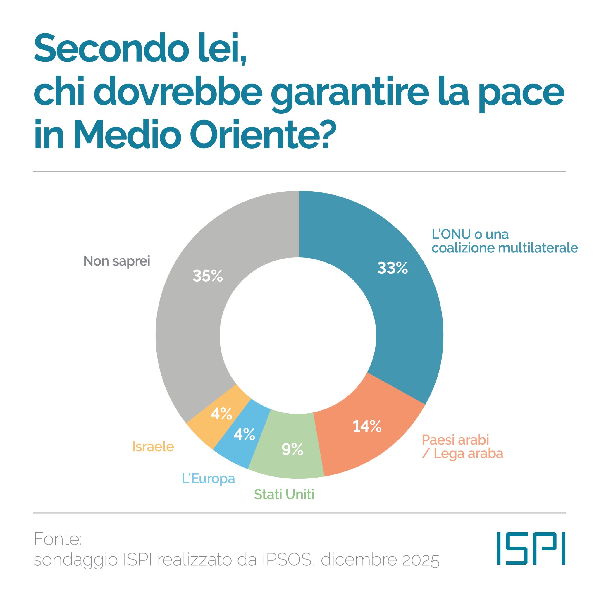 Questa ambivalenza è evidente quando si guarda alla gestione delle crisi internazionali. Sul Medio Oriente, ad esempio, gli italiani non attribuiscono all’Unione europea un ruolo significativo. Solo una minoranza crede che l’Europa possa garantire la pace nella regione. Prevale invece una preferenza per soluzioni multilaterali, sotto l’egida dell’ONU o di coalizioni internazionali più ampie. È una sfiducia che pesa come un macigno sull’idea stessa di “Europa geopolitica”, tanto evocata quanto mai realizzata.